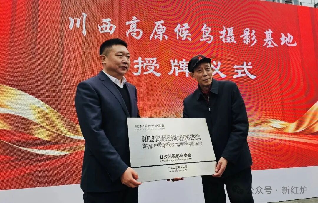 开幕式上,中共炉霍县委常委、宣传部部长杨胜致辞。他表示,此次活动以“摄影展+展销会”为双载体,蕴含三重深意:一是以镜头为笔触,让生态之美“走出去”。现场百幅展架上的每一幅候鸟作品,都是炉霍生态保护的“鲜活答卷”,希望通过这些光影,让更多人看见高原的灵动与纯净;二是以帮扶为纽带,让民生好物“销得好”。农特产品展销位上的有机牦牛肉、非遗文创产品,是炉霍群众勤劳的结晶,更是两地情谊的见证,每一笔消费都是对乡村振兴的直接助力;三是以生态为底色,让文旅潜力“活起来”。这既是对炉霍生态价值的认可,更翻开了“生态+文旅”融合发展的新篇章,期待更多人走进炉霍,赏候鸟、品非遗、游高原。随后,甘孜州摄影家协会为炉霍授予“川西高原候鸟摄影基地”称号,协会主席王明阳与杨胜共同完成授牌仪式。
